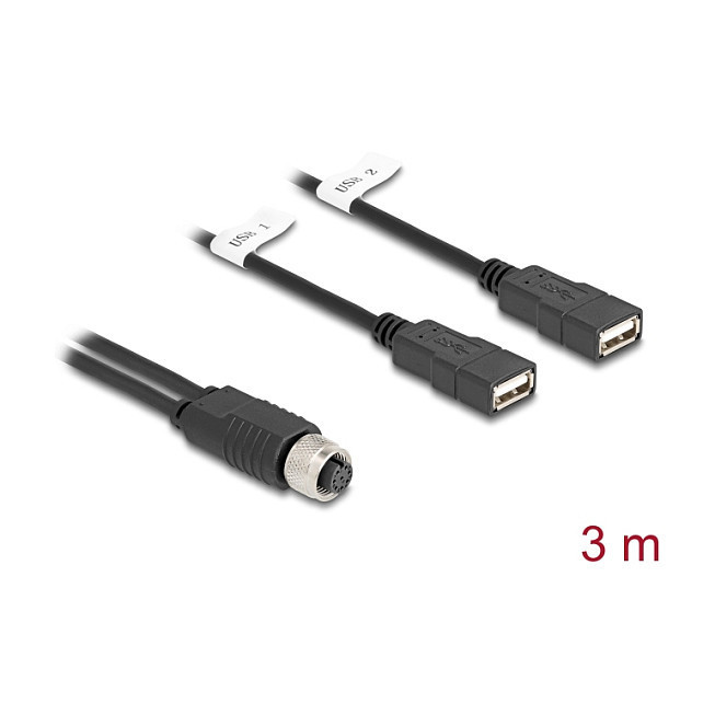 "DeLOCK 60651. Cable length: 3 m, Connector 1: M12, Connector 2: 2 x USB Type-A"\n"This M12 to USB 2.0 cable by Delock can be used for the industrial application e.g. for sensors and automation modules."