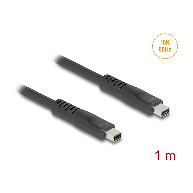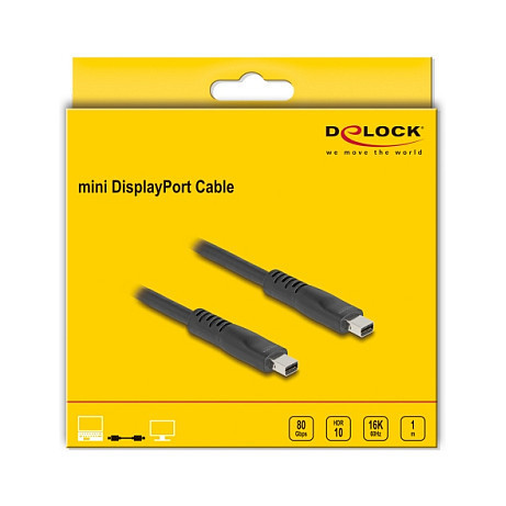 "DeLOCK 81176. Cable length: 1 m, Connector 1: Mini DisplayPort, Connector 2: Mini DisplayPort. Cable diameter: 6.2 mm. Package type: Hanging box. Quantity per pack: 1 pc(s). Country of origin: China"\n"This Mini DisplayPort cable by Delock can be used to connect devices with Mini DisplayPort interface, e.g. displays, projectors or TVs, to a PC or laptop.