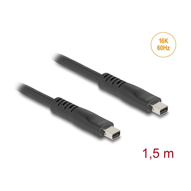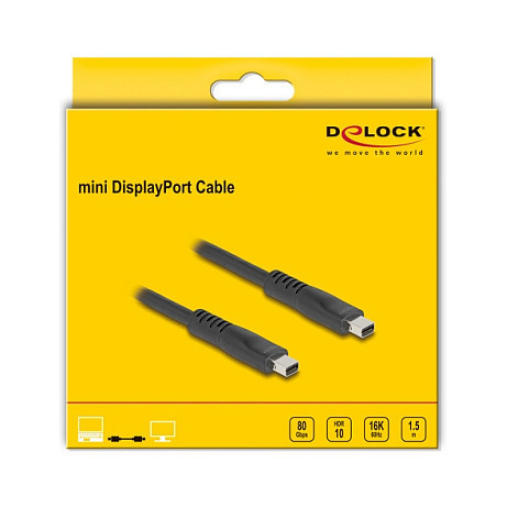 "DeLOCK 81177. Cable length: 1.5 m, Connector 1: Mini DisplayPort, Connector 2: Mini DisplayPort. Cable diameter: 7.3 mm. Package type: Hanging box. Quantity per pack: 1 pc(s). Country of origin: China"\n"This Mini DisplayPort cable by Delock can be used to connect devices with Mini DisplayPort interface, e.g. displays, projectors or TVs, to a PC or laptop.
