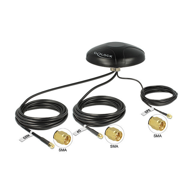 "DeLOCK 12455. Impedance: 50 Ω. Antenna type: Omni-directional antenna, Antenna connector type: SMA, Connector gender: Male. Power consumption: 15 mA. Height: 65 mm, Diameter: 14.4 cm, Weight: 1.2 kg. Package type: Polybag"\n"This Delock multi-band antenna has three physically separate transmitting and receiving units. Two PIFA antennas, respectively, for LTE and GSM/UMTS are responsible for sending and receiving in these areas. The GPS patch antenna receives the signals of the Global Navigation Satellite System GPS. Due to its outdoor features, the multiband antenna is well suitable for usage in harsh areas such as transportation, forestry, agriculture, construction and in the maritime sector. It is waterproof, shock resistant and can be used in the extended temperature range."