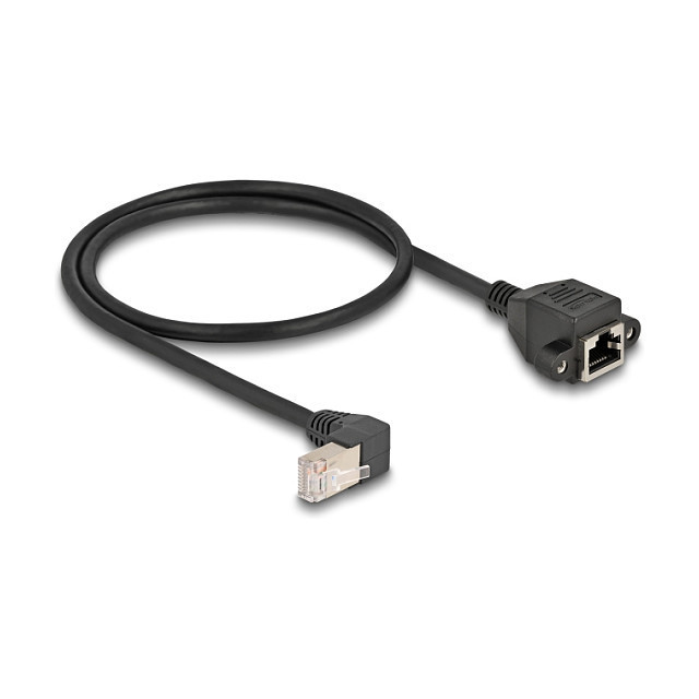 "DeLOCK Network Extension Cable S/FTP RJ45 plug 90° angled to RJ45 built-in jack Cat.6A 0.5 m black. Cable length: 0.5 m, Cable standard: Cat6a, Cable shielding: S/FTP (S-STP), Connector 1: RJ-45, Connector 2: RJ-45, Product colour: Black"\n"This network cable by Delock can be used to extend and connect various devices. The screwable RJ45 jack can be attached, for e.g., to a slot bracket or a housing with a suitable cut-out.