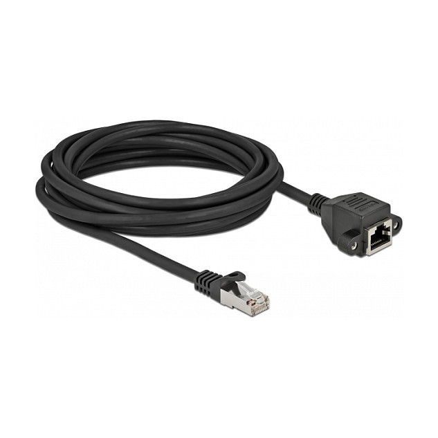"DeLOCK Network Extension Cable S/FTP RJ45 plug to RJ45 jack Cat.6A 5 m black. Cable length: 5 m, Cable standard: Cat6a, Cable shielding: S/FTP (S-STP), Connector 1: RJ-45, Connector 2: RJ-45, Product colour: Black"\n"This network cable by Delock can be used to extend and connect various devices. The screwable RJ45 jack can be attached, for e.g., to a slot bracket or a housing with a suitable cut-out."
