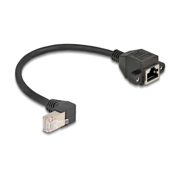"DeLOCK Network Extension Cable S/FTP RJ45 plug 90° angled to RJ45 built-in jack Cat.6A 0.25 m black. Cable length: 0.25 m, Cable standard: Cat6a, Cable shielding: S/FTP (S-STP), Connector 1: RJ-45, Connector 2: RJ-45, Product colour: Black"\n"This network cable by Delock can be used to extend and connect various devices. The screwable RJ45 jack can be attached, for e.g., to a slot bracket or a housing with a suitable cut-out.