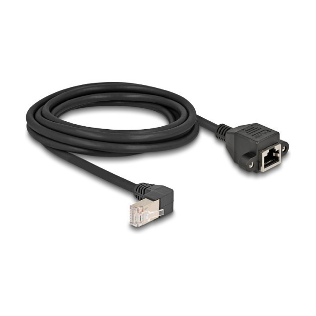 "DeLOCK Network Extension Cable S/FTP RJ45 plug 90° angled to RJ45 built-in jack Cat.6A 3 m black. Cable length: 3 m, Cable standard: Cat6a, Cable shielding: S/FTP (S-STP), Connector 1: RJ-45, Connector 2: RJ-45, Product colour: Black"\n"This network cable by Delock can be used to extend and connect various devices. The screwable RJ45 jack can be attached, for e.g., to a slot bracket or a housing with a suitable cut-out.
