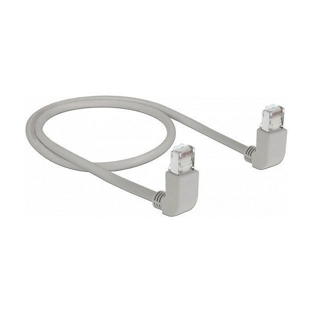 "DeLOCK 83513. Cable length: 0.5 m, Cable standard: Cat6a, Cable shielding: S/FTP (S-STP), Connector 1: RJ-45, Connector 2: RJ-45, Product colour: Grey"\n"This network cable by Delock can be used to connect different networking devices, e.g. a NIC to a switch or a patch panel. The angled plug enables a space-saving installation in tight spaces behind appliances or in network closets."
