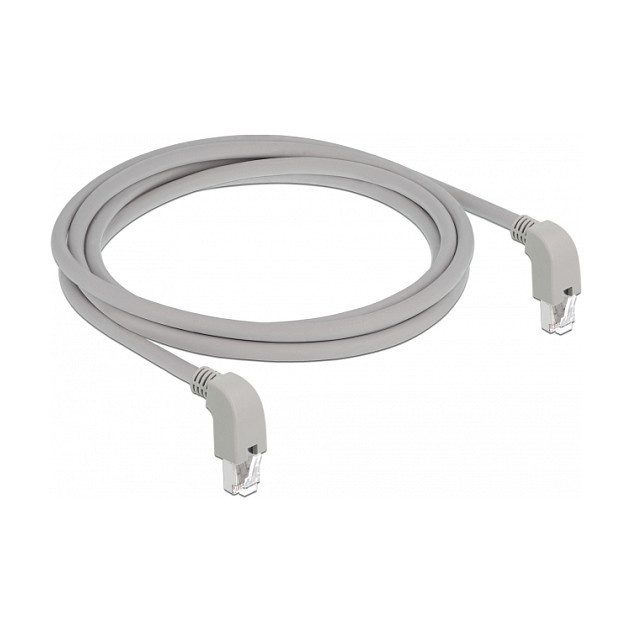 "DeLOCK 85878. Cable length: 2 m, Cable standard: Cat6a, Cable shielding: S/FTP (S-STP), Connector 1: RJ-45, Connector 2: RJ-45, Product colour: Grey"\n"This network cable by Delock can be used to connect different networking devices, e.g. a NIC to a switch or a patch panel. The angled plug enables a space-saving installation in tight spaces behind appliances or in network closets."