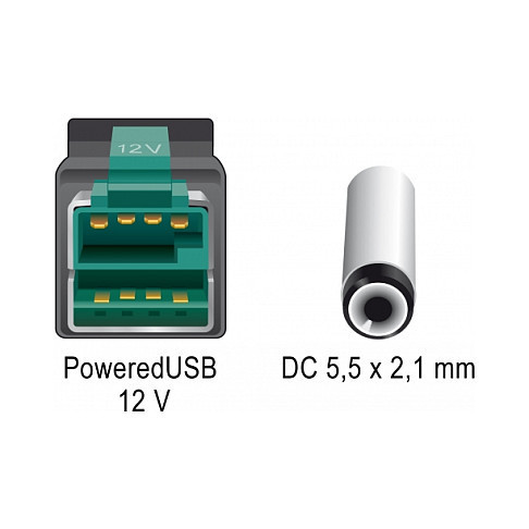 "DeLOCK 85497. Cable length: 1 m, Connector 1: PoweredUSB"\n"This PoweredUSB cable by Delock can be used to supply power to a device with DC 5.5 x 2.1 mm female port via a PC or hub with PoweredUSB 12 V port."