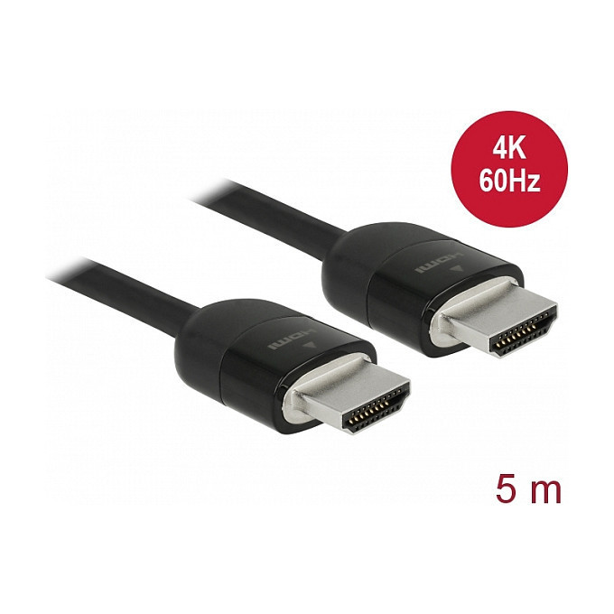 "DeLOCK 84966. Cable length: 5 m, Connector 1: HDMI Type A (Standard), Connector 1 gender: Male, Connector 2: HDMI Type A (Standard), Connector 2 gender: Male, Connector contacts plating: Gold, Data transfer rate: 18 Gbit/s, Audio Return Channel (ARC), Product colour: Black"\n"This certified premium HDMI cable by Delock can be used to connect devices with an HDMI interface, such as televisions, Blu-ray players, monitors or projectors. By supporting a maximum bandwidth of 18 Gbps, content can be displayed with resolutions of up to 4K Ultra HD (3840 x 2160 @ 60 Hz).