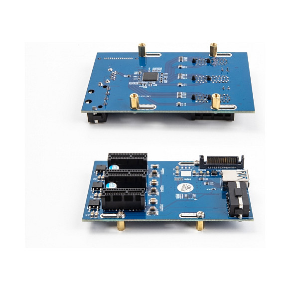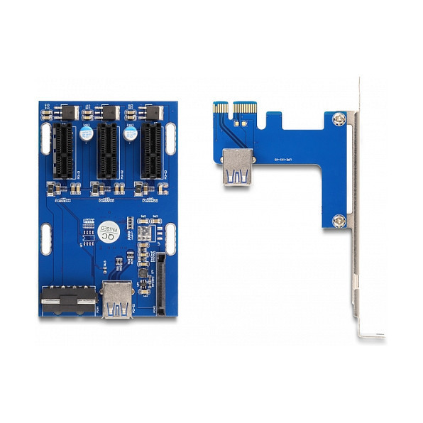 "DeLOCK Riser Card PCI Express x1 to 3 x PCIe x1 with 50 cm USB cable. Host interface: PCIe, Output interface: PCIe, SATA, USB 3.2 Gen 1 (3.1 Gen 1), Host interface gender: Male. Product colour: Blue, Purpose: PC. Chipset: Asmedia ASM1184e, Data transfer rate (max): 0.8 Gbit/s. Width: 64 mm, Depth: 99 mm, Height: 15 mm. Quantity per pack: 1 pc(s), Cables included: USB, Package type: Hanging box"\n"The PCI Express riser card by Delock can be plugged into any PCI Express x1 slot on the motherboard. The PCI Express board can be mounted in a different position in the case. This allows up to three PCIe cards to be operated in each PCIe slot of a motherboard.