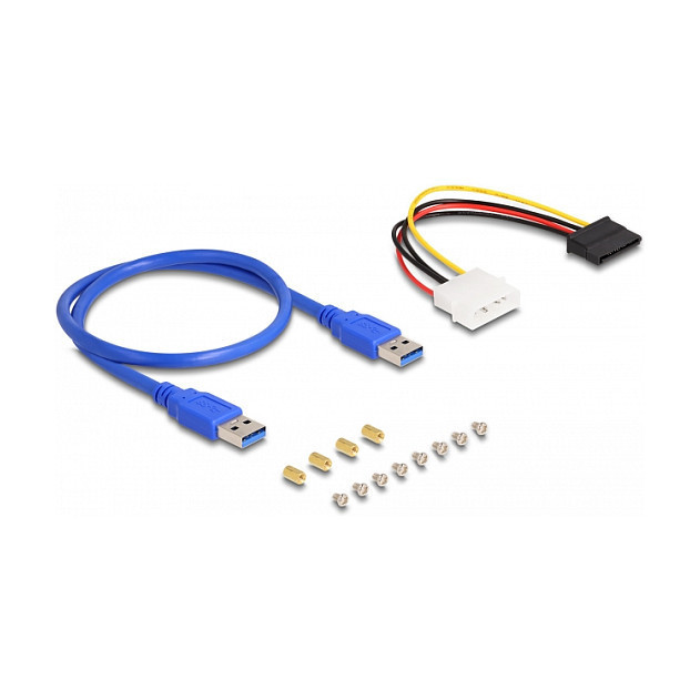 The package content includes a USB 3.0 riser cable with a length of 50 cm. No USB signals are transmitted through this cable, therefore it is not possible to exchange it with a different or longer cable.