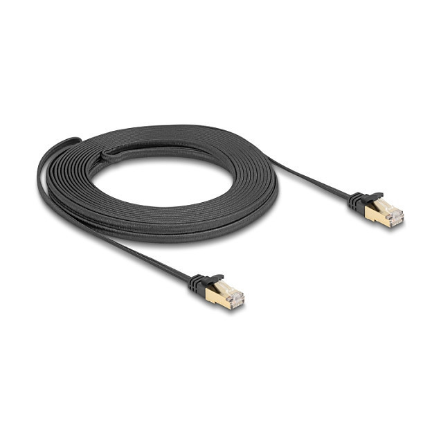"DeLOCK RJ45 Flat Network Cable with braided jacket Cat.6A U/FTP plug to plug 10 m black. Cable length: 10 m, Cable standard: Cat6a, Cable shielding: S/FTP (S-STP), Connector 1: RJ-45, Connector 2: RJ-45, Product colour: Black"\n"This network cable by Delock can be used to connect different networking devices, e.g. a NIC to a switch or a patch panel.