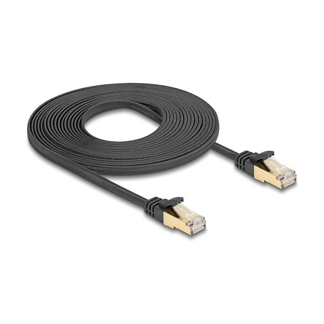 "DeLOCK RJ45 Flat Network Cable with braided jacket Cat.6A U/FTP plug to plug 5 m black. Cable length: 5 m, Cable standard: Cat6a, Cable shielding: S/FTP (S-STP), Connector 1: RJ-45, Connector 2: RJ-45, Product colour: Black"\n"This network cable by Delock can be used to connect different networking devices, e.g. a NIC to a switch or a patch panel.