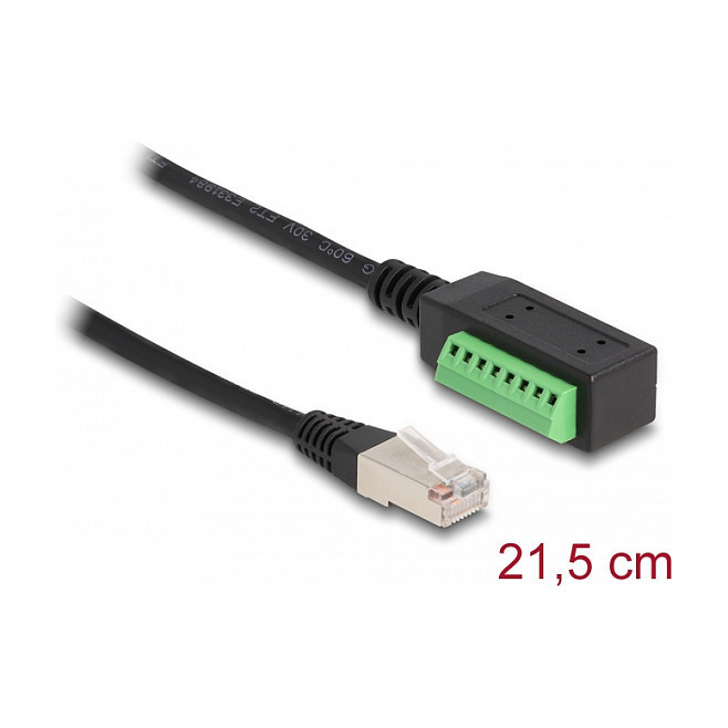 "DeLOCK RJ45 Cable Cat.5e plug to Terminal Block Adapter 21.5 cm. Host interface: RJ-45, Output interface: Terminal. Product colour: Black, Green, Country of origin: China. Connector 1 gender: Male, Connector 2 gender: Female. Quantity per pack: 1 pc(s). Cable length: 0.215 m"\n"This cable by Delock can be used to extend and connect various network devices. Strands with stripped ends can be connected via the terminal block."