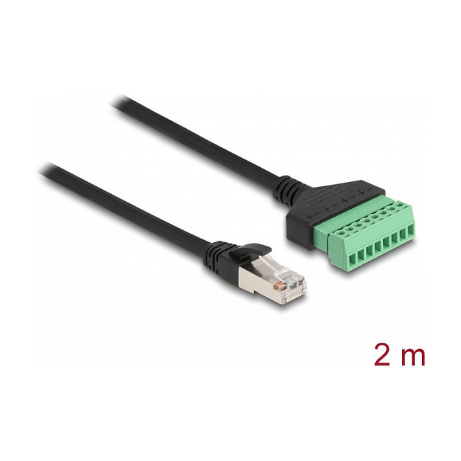 "DeLOCK RJ45 Cable Cat.6 plug to Terminal Block Adapter 2 m 2-part. Cable length: 2 m, Cable standard: Cat6, Cable shielding: U/UTP (UTP), Connector 1: RJ-45, Product colour: Black, Green"\n"This cable by Delock can be used to extend and connect various network devices. Strands with stripped ends can be connected via the terminal block."