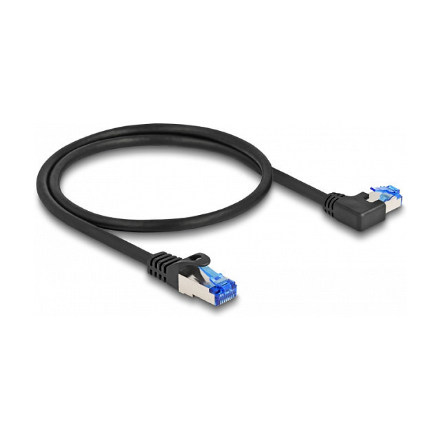 "DeLOCK RJ45 Network Cable Cat.6A S/FTP straight / left angled 0.5 m black. Cable length: 0.5 m, Cable standard: Cat6a, Cable shielding: S/FTP (S-STP), Connector 1: RJ-45, Connector 2: RJ-45, Product colour: Black"\n"This network cable by Delock can be used to connect different networking devices, e.g. a NIC to a switch or a patch panel.