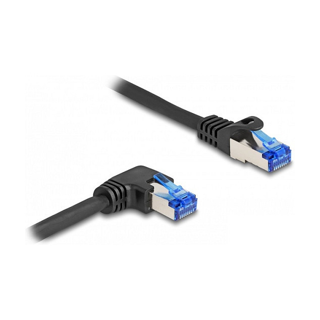 "DeLOCK RJ45 Network Cable Cat.6A S/FTP straight / right angled 0.5 m black. Cable length: 0.5 m, Cable standard: Cat6a, Cable shielding: S/FTP (S-STP), Connector 1: RJ-45, Connector 2: RJ-45, Product colour: Black"\n"This network cable by Delock can be used to connect different networking devices, e.g. a NIC to a switch or a patch panel.