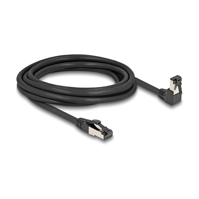 "DeLOCK RJ45 Network Cable Cat.8.1 S/FTP 90° downwards angled / straight 3 m black. Cable length: 3 m, Cable standard: Cat8.1, Cable shielding: S/FTP (S-STP), Connector 1: RJ-45, Connector 2: RJ-45, Data transfer rate: 40000 Mbit/s, Product colour: Black"\n"Description