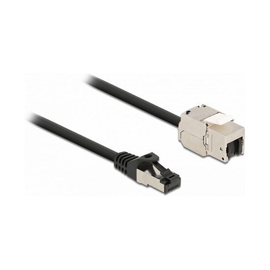 "DeLOCK RJ45 Network Cable Cat.8.1 S/FTP plug 45° left angled to plug straight up to 40 Gbps 3 m black. Cable length: 3 m, Cable standard: Cat8.1, Cable shielding: S/FTP (S-STP), Connector 1: RJ-45, Connector 2: RJ-45, Data transfer rate: 40000 Mbit/s, Product colour: Black"\n"This network cable by Delock can be used to connect various devices and is suitable for 40GBASE-T Ethernet applications with a frequency of 2 GHz and a data transfer rate of up to 40 Gbps.