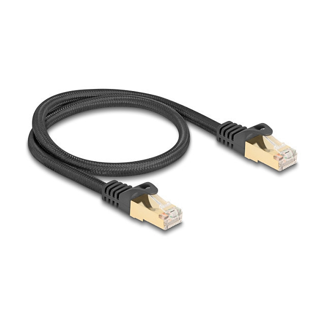 "DeLOCK RJ45 Network Cable with braided jacket Cat.6A S/FTP plug to plug 0.5 m black. Cable length: 0.5 m, Cable standard: Cat6a, Cable shielding: S/FTP (S-STP), Connector 1: RJ-45, Connector 2: RJ-45, Product colour: Black"\n"This network cable by Delock can be used to connect different networking devices, e.g. a NIC to a switch or a patch panel.
