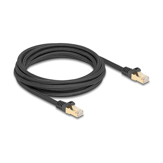 "DeLOCK RJ45 Network Cable with braided jacket Cat.6A S/FTP plug to plug 3 m black. Cable length: 3 m, Cable standard: Cat6a, Cable shielding: S/FTP (S-STP), Connector 1: RJ-45, Connector 2: RJ-45, Product colour: Black"\n"This network cable by Delock can be used to connect different networking devices, e.g. a NIC to a switch or a patch panel.