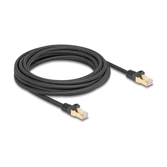 "DeLOCK RJ45 Network Cable with braided jacket Cat.6A S/FTP plug to plug 5 m black. Cable length: 5 m, Cable standard: Cat6a, Cable shielding: S/FTP (S-STP), Connector 1: RJ-45, Connector 2: RJ-45, Product colour: Black"\n"This network cable by Delock can be used to connect different networking devices, e.g. a NIC to a switch or a patch panel.