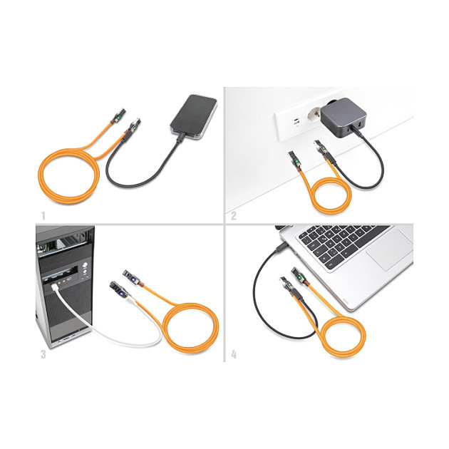 The network cable is equipped with a port finder function that enables quick and easy identification of the cable for tracing the cable route. When power is supplied to the USB Type-C™ socket, flashing LEDs on both RJ45 plugs signal their location. This patch cable is particularly suitable for use in office environments, industrial facilities and data centres. "