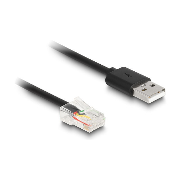 "DeLOCK RJ50 to USB 2.0 Type-A Coiled Cable 2 m. Product colour: Black, Connector 1: RJ-45, Connector 2: USB Type-A"\n"Description