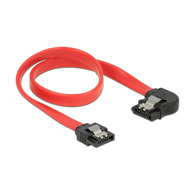 "DeLOCK 83963. Cable length: 0.3 m, Connector 1: SATA 7-pin, Connector 2: SATA 7-pin. Package type: Polybag"\n"This SATA cable by Delock enables the internal connection of various SATA devices, e.g. HDDs, controller cards or Flash memories. It complies with the latest standard and provides a data transfer rate of up to 6 Gb/s. It is downwards compatible to the previous SATA versions, but can then only reach the respective transfer speed. When connecting this cable to a HDD the cable will be lead to the left. The metal clips on the connectors ensure that the cable reliably clicks into place."