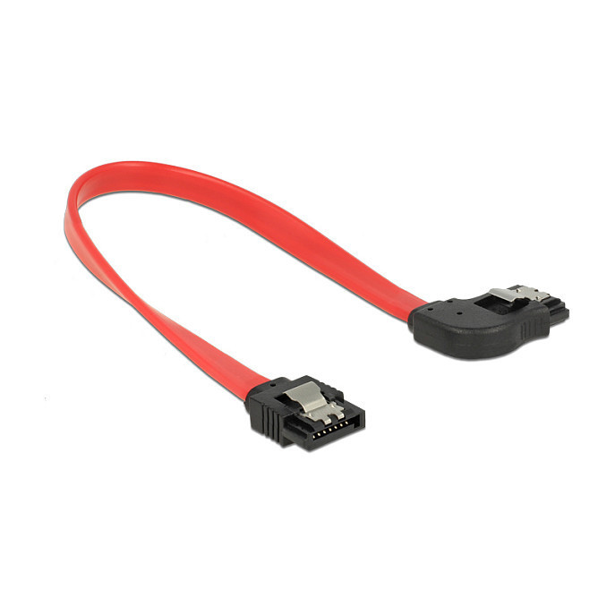 "DeLOCK 83967. Cable length: 0.2 m, Connector 1: SATA 7-pin, Connector 2: SATA 7-pin. Package type: Polybag"\n"This SATA cable by Delock enables the internal connection of various SATA devices, e.g. HDDs, controller cards or Flash memories. It complies with the latest standard and provides a data transfer rate of up to 6 Gb/s. It is downwards compatible to the previous SATA versions, but can then only reach the respective transfer speed. When connecting this cable to a HDD the cable will be lead to the right. The metal clips on the connectors ensure that the cable reliably clicks into place."