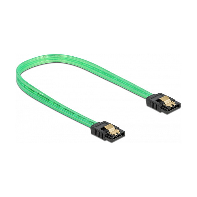 "DeLOCK SATA 6 Gb/s Cable UV glow effect green 20 cm. Cable length: 0.2 m, Cable type: SATA III, Connector 1: SATA 7-pin. Quantity per pack: 1 pc(s), Package type: Polybag"\n"This SATA cable by Delock enables the internal connection of various SATA devices, e.g. HDDs, controller cards or flash memories. The metal clips on the connectors ensure that the cable reliably clicks into place.