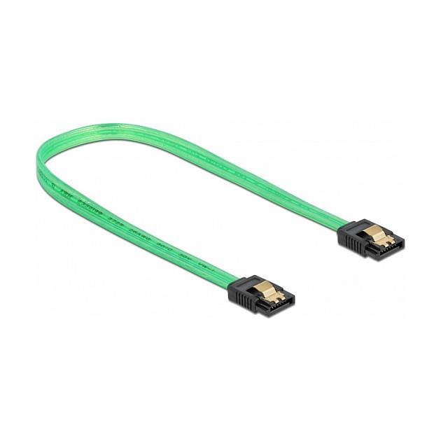 "DeLOCK SATA 6 Gb/s Cable UV glow effect green 50 cm. Cable length: 0.5 m, Cable type: SATA III, Connector 1: SATA 7-pin. Quantity per pack: 1 pc(s), Package type: Polybag"\n"This SATA cable by Delock enables the internal connection of various SATA devices, e.g. HDDs, controller cards or flash memories. The metal clips on the connectors ensure that the cable reliably clicks into place.