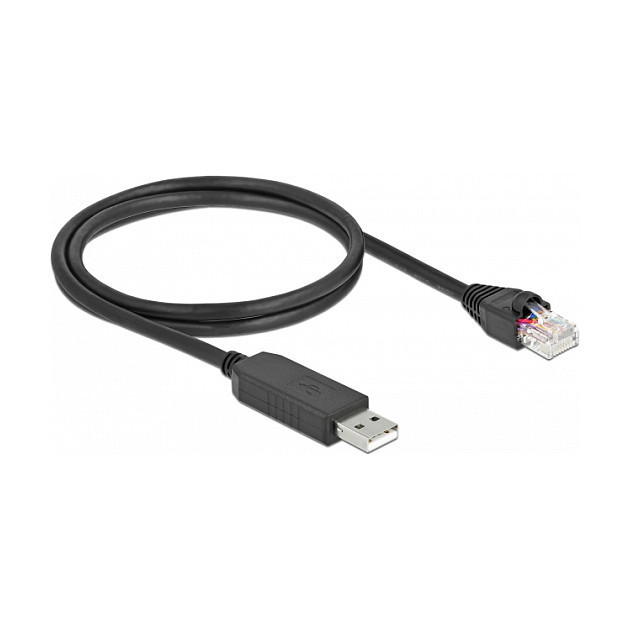 "DeLOCK Serial Connection Cable with FTDI chipset, USB 2.0 Type-A male to RS-232 RJ45 male 1 m black. Cable length: 1 m, Connector 1: USB Type-A, Connector 2: RJ-45, Product colour: Black"\n"This USB 2.0 to RS-232 cable by Delock can be used for the console control at CISCO routers, switches, access points and other compatible devices via PC or laptop."