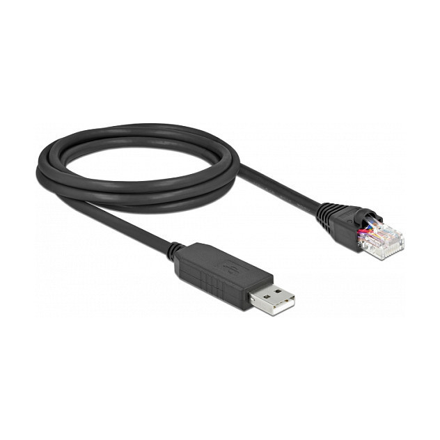"DeLOCK Serial Connection Cable with FTDI chipset, USB 2.0 Type-A male to RS-232 RJ45 male 2 m black. Connector 1: RJ-45, Connector 2: USB 2.0 Type-A, Cable length: 2 m. Product colour: Black"\n"This USB 2.0 to RS-232 cable by Delock can be used for the console control at CISCO routers, switches, access points and other compatible devices via PC or laptop."