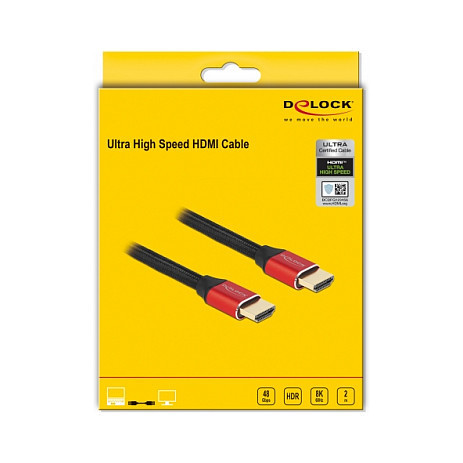 "DeLOCK Ultra High Speed HDMI Cable 48 Gbps 8K 60 Hz red 2 m certified. Cable length: 2 m, Connector 1: HDMI Type A (Standard), Connector 1 gender: Male, Connector 2: HDMI Type A (Standard), Connector 2 gender: Male, Connector contacts plating: Gold, 3D, Data transfer rate: 48 Gbit/s, Audio Return Channel (ARC), Product colour: Black, Red"\n"This high-quality Ultra High Speed HDMI cable by Delock can be used to connect devices with an HDMI interface, such as televisions, Blu-ray players, monitors or projectors. By supporting a maximum bandwidth of 48 Gbps, content can be displayed in 8K Ultra HD (7680 x 4320 @ 60 Hz) resolution.