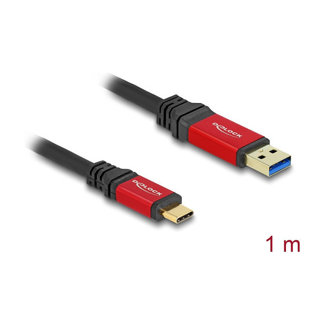 "DeLOCK USB 10 Gbps Cable USB Type-A male to USB Type-C male 1 m red metal. Cable length: 1 m. Connector 1: USB A, Connector 2: USB C, USB version: USB 3.2 Gen 2 (3.1 Gen 2), Maximum data transfer rate: 10 Gbit/s, Connector contacts plating: Gold, Product colour: Black, Red"\n"This USB cable by Delock enables the connection between a device with a USB Type-C™ connector, e.g. a smartphone, and a PC or laptop equipped with a USB Type-A port.