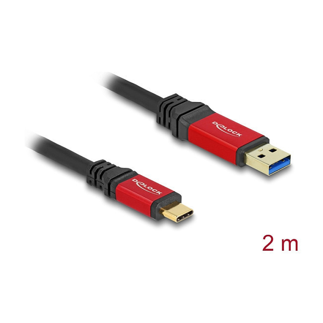 "DeLOCK USB 10 Gbps Cable USB Type-A male to USB Type-C male 2 m red metal. Cable length: 2 m. Connector 1: USB A, Connector 2: USB C, USB version: USB 3.2 Gen 2 (3.1 Gen 2), Maximum data transfer rate: 10 Gbit/s, Connector contacts plating: Gold, Product colour: Black, Red"\n"This USB cable by Delock enables the connection between a device with a USB Type-C™ connector, e.g. a smartphone, and a PC or laptop equipped with a USB Type-A port.