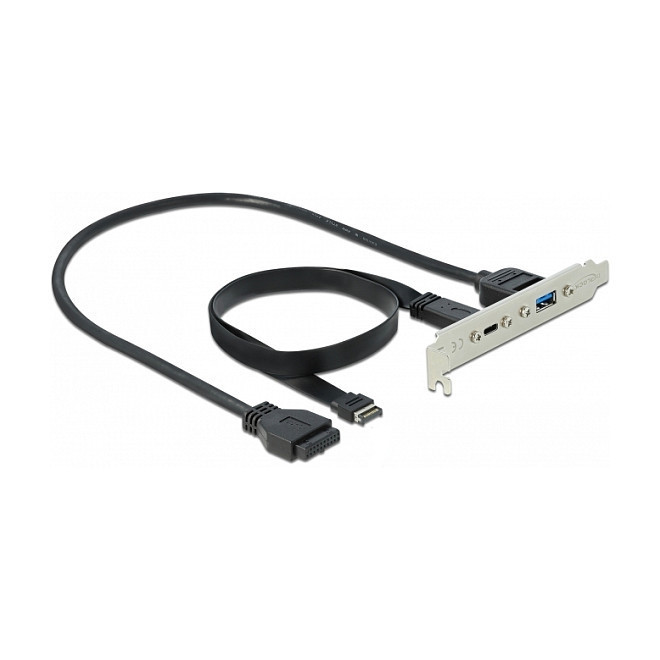 "DeLOCK Slot Bracket with 1 x USB Type-C and 1 x USB Type-A Port. Cable length: 0.5 m, USB version: USB 3.2 Gen 2 (3.1 Gen 2), Connector 1: USB C. Quantity per pack: 1 pc(s). Package type: Polybag. Country of origin: China"\n"With this slot bracket by Delock a PC can be extended by a USB Type-A and a USB Type-C™ port. At the USB Type-A port up to 5 V / 900 mA and a data transfer rate of up to 5 Gbps are available, at the USB Type-C™ port max. 20 V / 3 A and a data transfer rate of up to 10 Gbps."