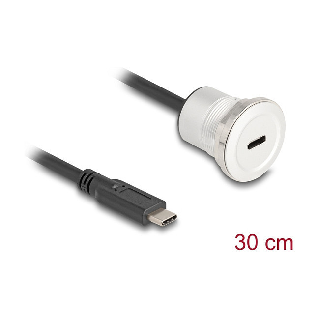 "DeLOCK 88183. Cable length: 0.3 m. Connector 1: USB C, Connector 2: USB C, Product colour: Black, Silver"\n"This cable by Delock can be used e.g. for installation in a panel or housing with a suitable opening. It can also be used to extend and connect various USB devices."