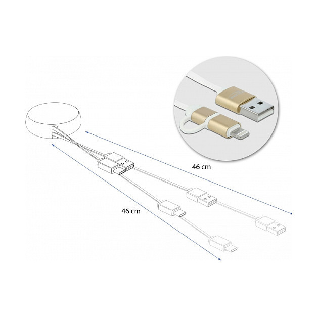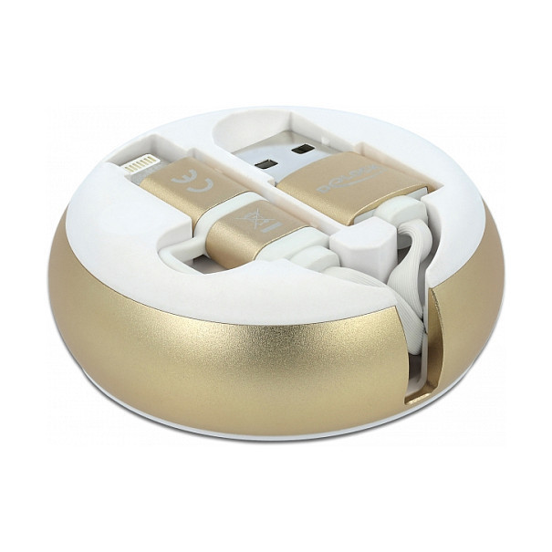 "DeLOCK USB 2.0 2 in 1 Retractable Cable Type-A to Micro-B and Lightning™ white / gold. Cable length: 0.92 m. Connector 1: USB A, Connector 2: Micro-USB B/Lightning, USB version: USB 2.0, Product colour: Gold, White"\n"Description