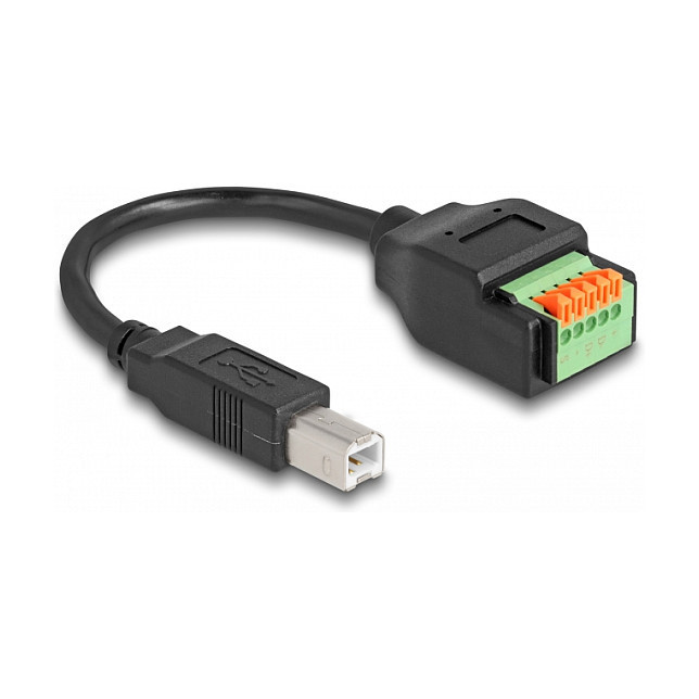 "DeLOCK USB 2.0 Cable Type-B male to Terminal Block Adapter with push button 15 cm. Connector 1: USB 2.0 Type-B, Connector 2: 5 pin terminal block, Cable length: 0.15 m. Product colour: Black, Green"\n"Description
