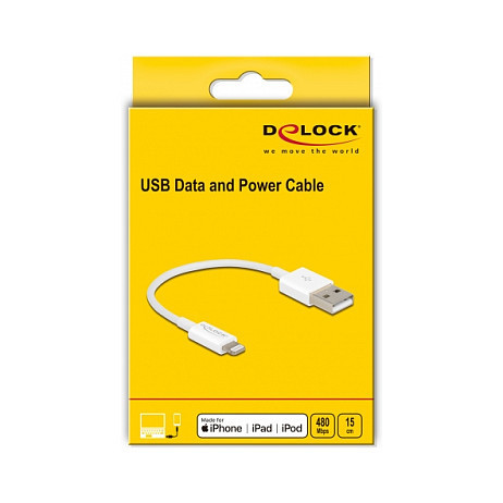 "DeLOCK USB data and power cable for iPhone™, iPad™, iPod™ white 15 cm. Cable length: 0.15 m, Connector 1: USB A, Connector 2: Micro-USB B/Lightning/Apple 30-pin. Output voltage: 3 V. Cable diameter: 3.7 mm. Quantity per pack: 1 pc(s), Package type: Box"\n"This USB data and charging cable by Delock is compatible to iPhone™, iPad™ and iPod™ with 8 pin Apple Lightning™ connector. Thus it supports easy and quick charging and data transfer of the iPhone™, iPad™ or iPod™."