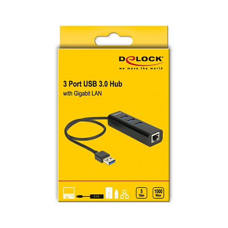 "DeLOCK USB 3.0 Hub 3 Port + 1 Port Gigabit LAN 10/100/1000 Mbps. Connectivity technology: Wired, Host interface: USB 3.2 Gen 1 (3.1 Gen 1) Type-A. Ethernet LAN data rates: 10,100,1000 Mbit/s, Networking standards: IEEE 802.3, IEEE 802.3ab, IEEE 802.3u. Product colour: Black, Hub interfaces: USB 3.2 Gen 1 (3.1 Gen 1) Type-A. Power source type: USB. Windows operating systems supported: Windows 10 Education, Windows 10 Education x64, Windows 10 Enterprise x64, Windows 10 Home,..., Mac operating systems supported: Mac OS X 10.9 Mavericks"\n