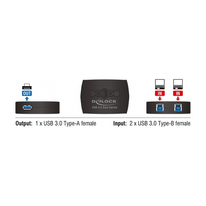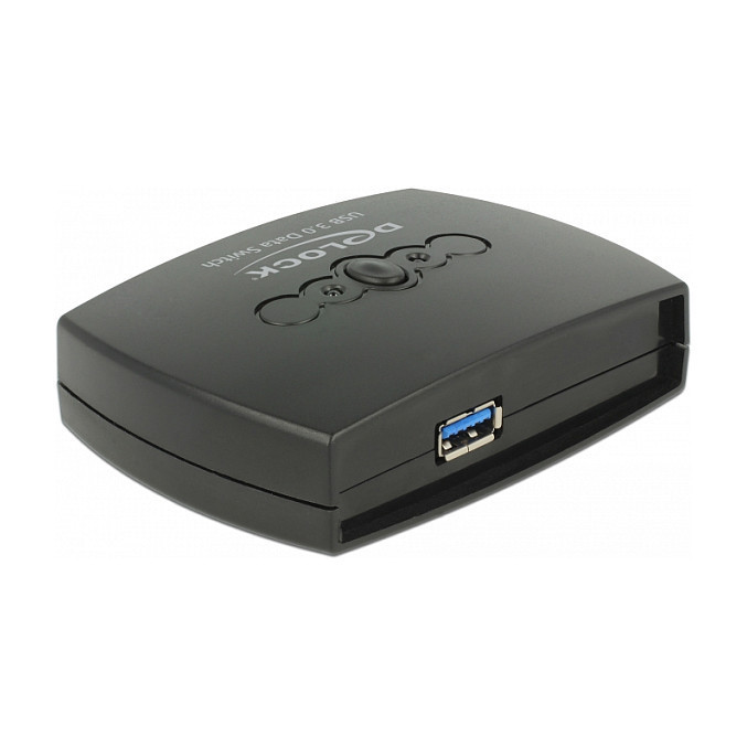 "DeLOCK 87723. Maximum data transfer rate: 5000 Gbit/s, Product colour: Black, Housing material: Plastic. Width: 69 mm, Depth: 95 mm, Height: 26 mm"\n"This sharing switch by Delock can be used on 2 computers to access a single USB device. For example, if a printer is connected, it can be selected by the button on the switch, which of the computers is connected to the printer. This connection can be switched at any time."