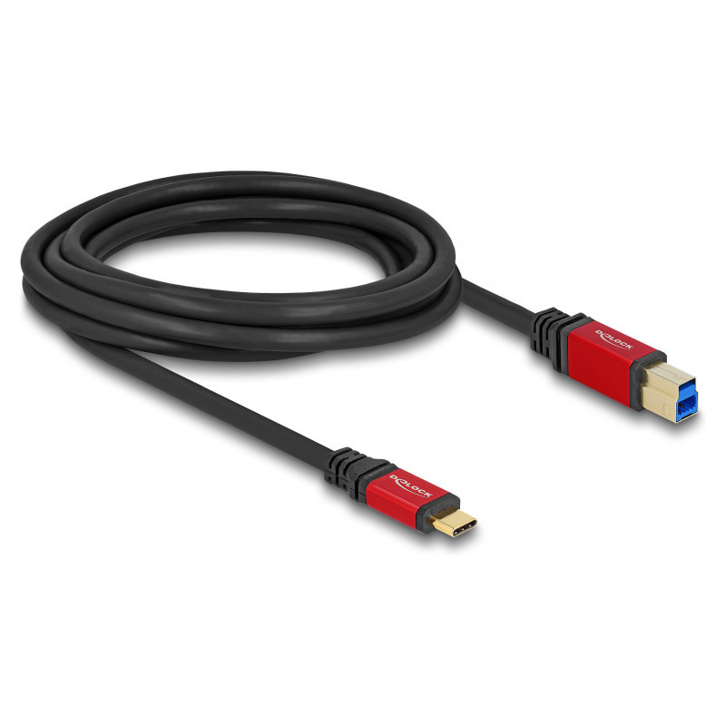 "DeLOCK USB 5 Gbps Cable USB Type-C male to USB Type-B male 3 m red metal. Cable length: 3 m. Connector 1: USB C, Connector 2: USB B, USB version: USB 3.2 Gen 1 (3.1 Gen 1), Maximum data transfer rate: 5 Gbit/s, Connector contacts plating: Gold, Product colour: Black, Red"\n"This USB cable by Delock enables the connection between a device with a USB Type-B connector and a PC or a laptop equipped with a free USB Type-C™ port.