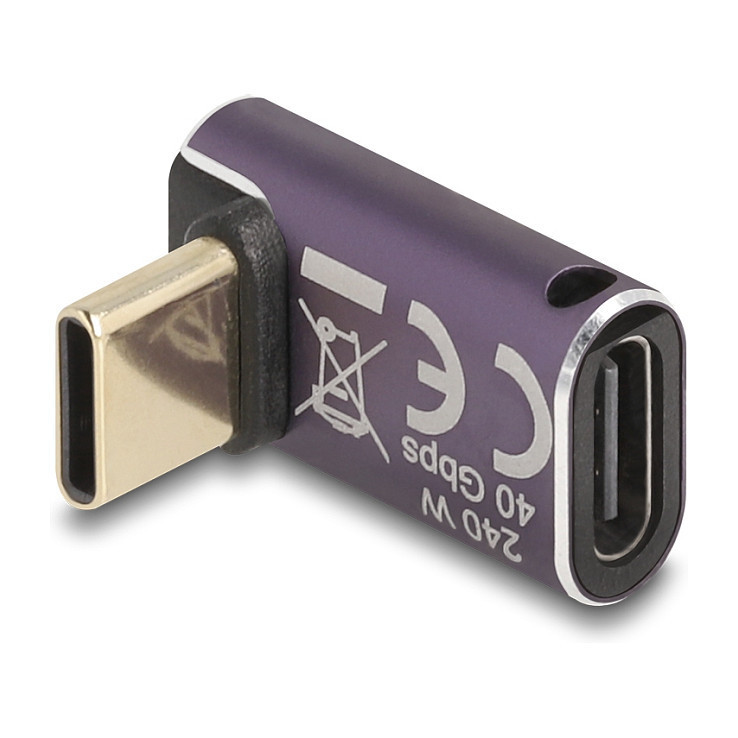 "DeLOCK USB Adapter 40 Gbps USB Type-C PD 3.1 240 W male to female angled 8K 60 Hz metal. Connector 1: USB-C, Connector 2: USB-C. Product colour: Anthracite"\n"This USB-C™ adapter by Delock can be used for the connection of USB-C™ devices. It can be also connected to a free USB-C™ port in order to prevent the interface from damage when it is under usage for high contact durability."