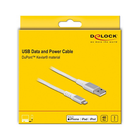 "DeLOCK USB data and power cable for iPhone, iPad, iPod DuPont Kevlar white 3 m. Cable length: 3 m, Connector 1: USB A, Connector 2: Lightning. Country of origin: China"\n"This USB data and charging cable by Delock is compatible to iPhone, iPad and iPod with 8 pin Apple Lightning connector. Thus it supports easy and quick charging and data transfer of the iPhone, iPad or iPod.