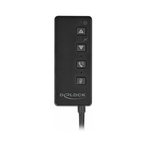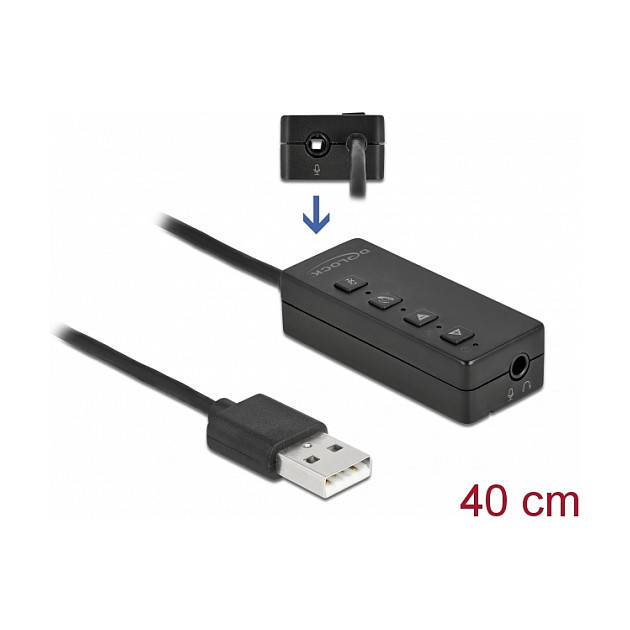 "DeLOCK USB Headset and Microphone Adapter with 2 x 3.5 mm Stereo Jack for Windows and Mac OS. Connector 1: 2 x 3.5mm, Connector 1 gender: Female, Connector 2: USB Type-A, Connector 2 gender: Male, Cable length: 0.4 m, Product colour: Black"\n"This USB adapter by Delock allows the connection of headsets and microphones with 3.5 mm stereo jack male and is especially designed for the use of video chat programs such as Teams, Zoom or Skype for Business.