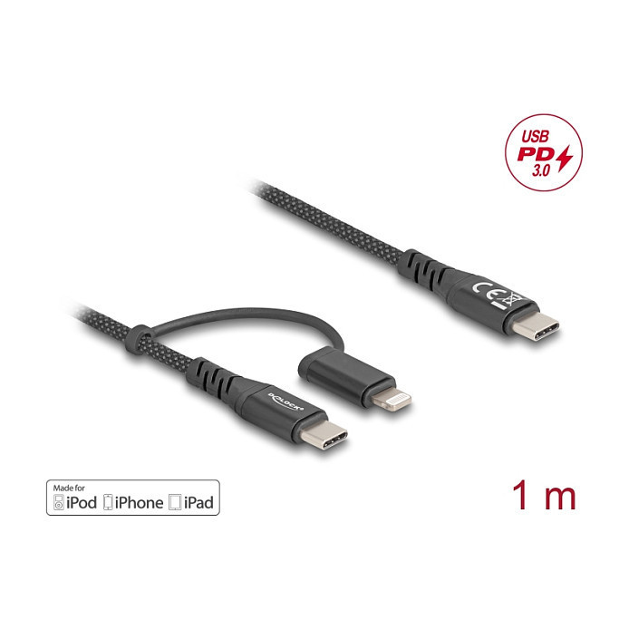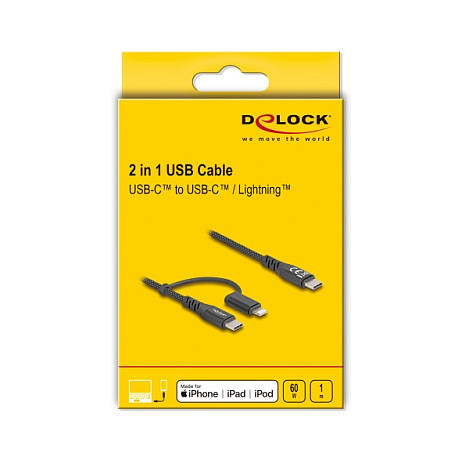 "DeLOCK 81170. Cable length: 1 m. Connector 1: USB C, Connector 2: USB C/Lightning, USB version: USB 2.0, Product colour: Black"\n"This 2 in 1 USB cable by Delock can be used as a data and charging cable for smartphones and is compatible with iPhone™, iPad™ and iPod™ with 8 pin Apple Lightning™ connector. With fast charge support, compatible Apple devices can also be connected to a USB Type-C™ PD charger for especially quick charging.