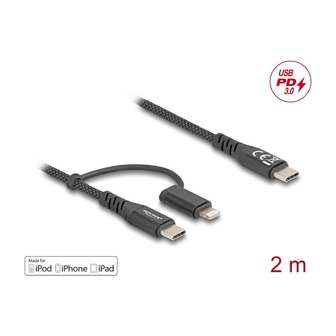 "DeLOCK 81171. Cable length: 2 m. Connector 1: USB C, Connector 2: USB C/Lightning, Product colour: Black"\n"This 2 in 1 USB cable by Delock can be used as a data and charging cable for smartphones and is compatible with iPhone™, iPad™ and iPod™ with 8 pin Apple Lightning™ connector. With fast charge support, compatible Apple devices can also be connected to a USB Type-C™ PD charger for especially quick charging.