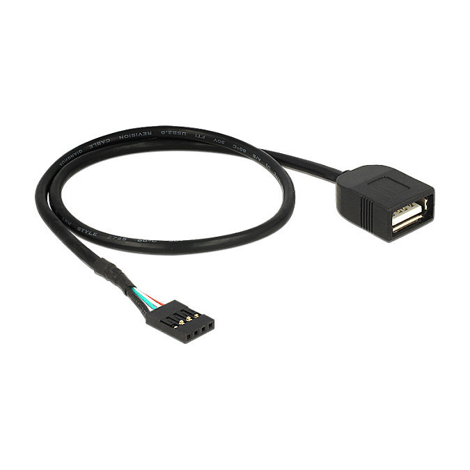 "DeLOCK 83825. Cable length: 0.4 m. Connector 2: USB A, USB version: USB 2.0, Connector gender: Female/Female, Maximum data transfer rate: 0.48 Gbit/s, Product colour: Black"\n"The Delock USB cable enables you to connect one USB device with a USB-A interface to an internal pin header of the mainboard."